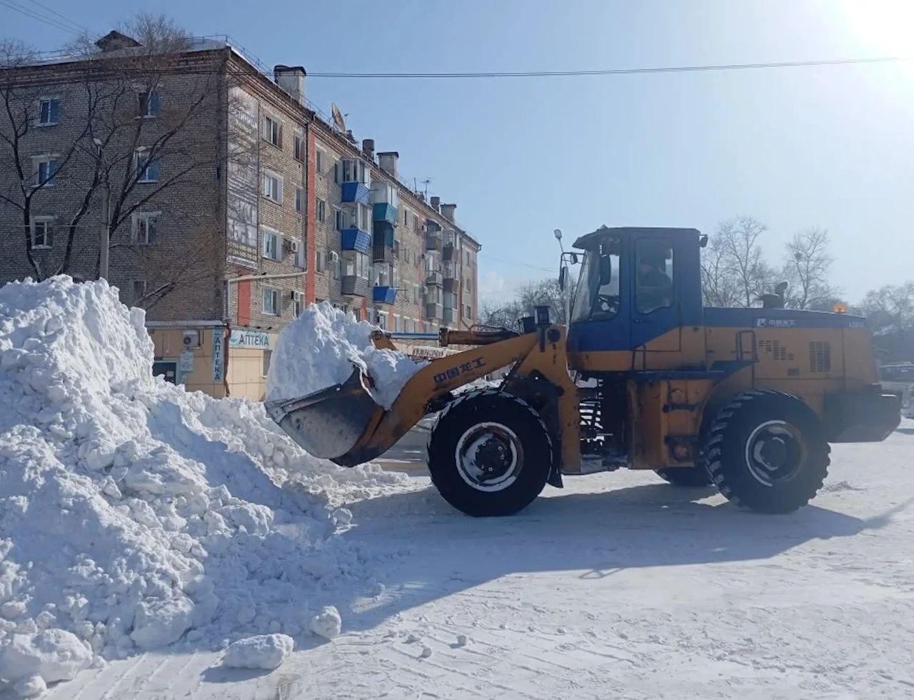 Складирование осуществляется на временной площадке - территории бывшего ипподрома. Грейдеры чистят дороги по ул. Авиационная, путепровод, кольцевую развязку, ул. Ленина, на участке от ул. Красноармейской до ул. Ударная, ул. Гагарина. Также в плане расчистка ул. Кирова. Бульдозер работает по ул. Набережная, ул. Чехова, ул. 9 Мая.
